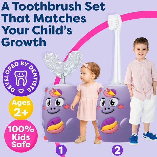 Trueocity Kids U Shape Toothbrush Auto Electric Toddler Rechargeable Kids Automatic Toothbrush | 360° U-Shaped Silicone Brush Head | Gentle Cleaning for Ages 2–7 | Unicorn Design (Purple)