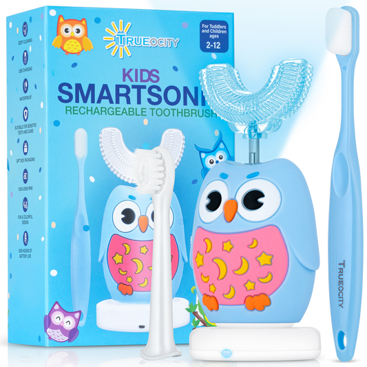 Trueocity Kids U Shape Toothbrush Auto Electric Toddler Rechargeable Kids Automatic Toothbrush | 360° U-Shaped Silicone Brush Head | Gentle Cleaning for Ages 2–7| Dinosaur Design (Blue)