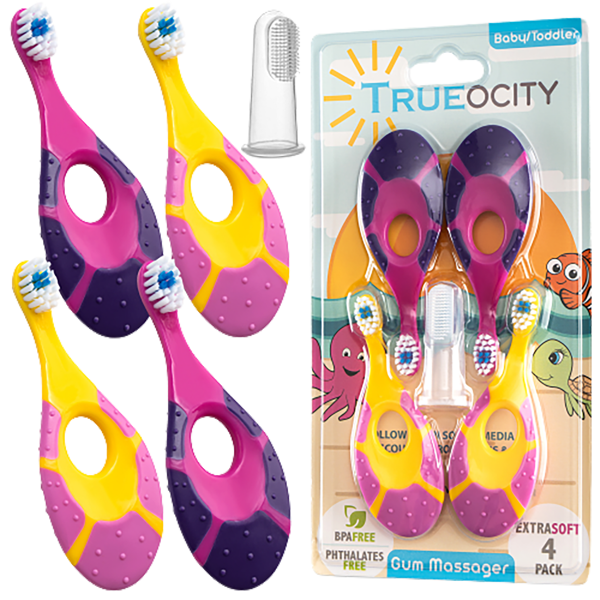 Trueocity Baby Toothbrush 4 Pack & Bonus Silicone Finger Brush, Soft Bristles, Toddler Toothbrushes, Infant & Training w/ Teething Handle, 0-2 Years, Pink Set