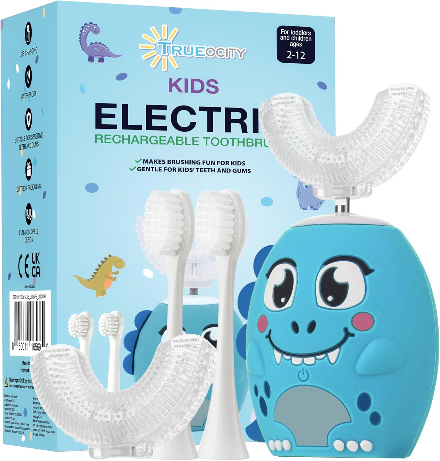 Trueocity Kids U Shape Toothbrush Auto Electric Toddler Rechargeable Kids Automatic Toothbrush | 360° U-Shaped Silicone Brush Head | Gentle Cleaning for Ages 2–7| Dinosaur Design (Blue)