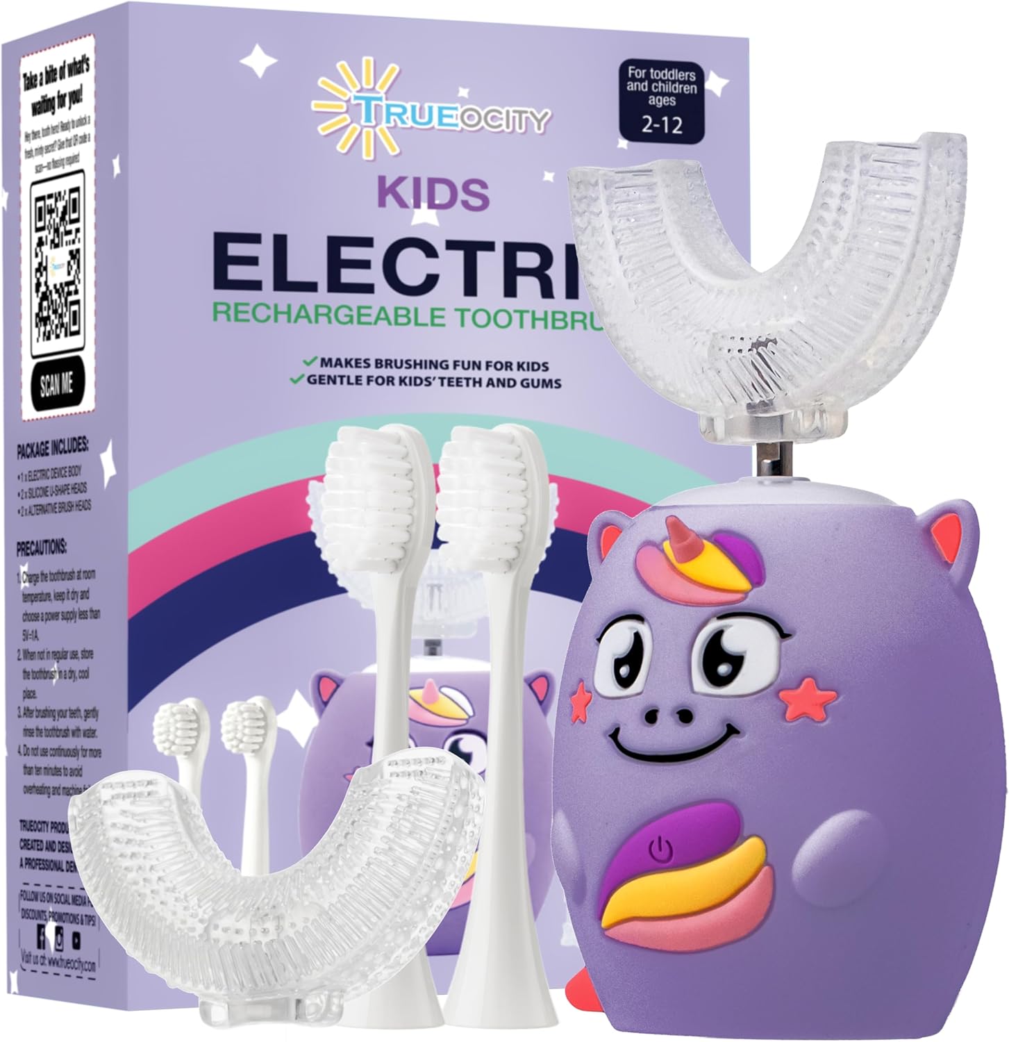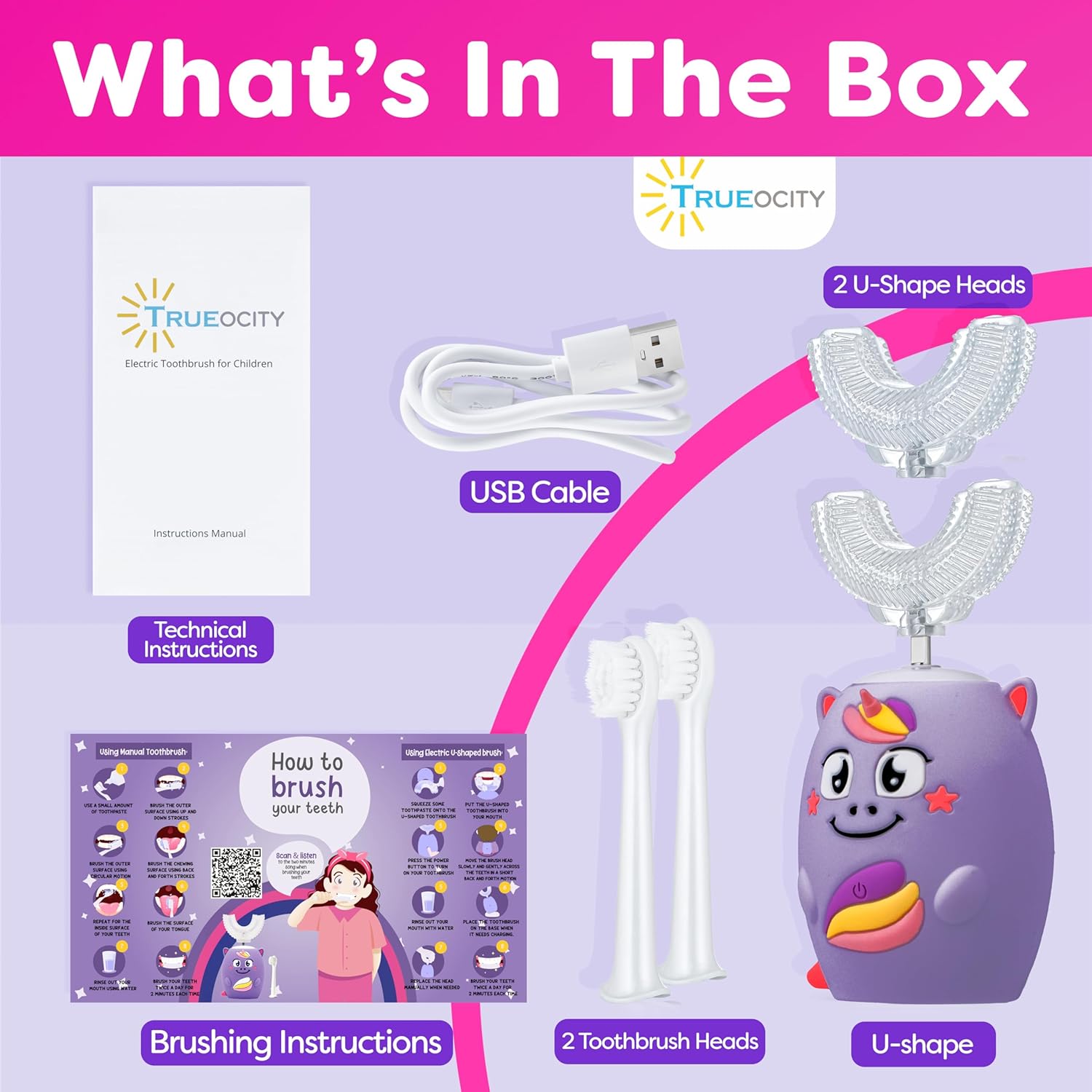 Trueocity Kids U Shape Toothbrush Auto Electric Toddler Rechargeable Kids Automatic Toothbrush | 360° U-Shaped Silicone Brush Head | Gentle Cleaning for Ages 2–7 | Unicorn Design (Purple)